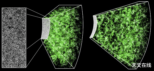 一部分的DESI数据绘制了从地球(中心)到数十亿光年外的天体。这些天体里有临近的明亮星系(黄色)、发光的红色星系(橙色)、发射线星系(蓝色)和类星体(绿色)。在插图中可以看到宇宙的大尺度结构,该图像显示了最密集的调查区域,低于DESI调查总体积的0.1%。