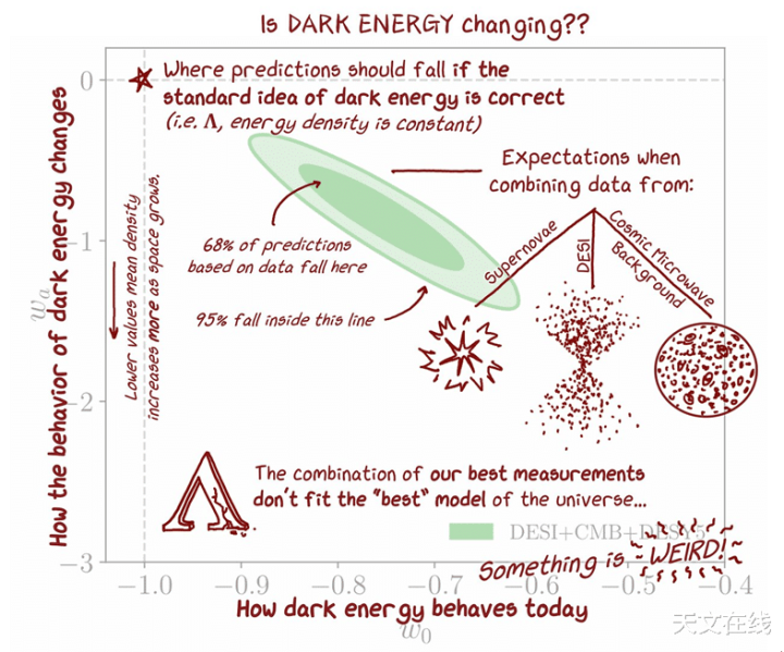 DESI新暗能量分析的等值线图,显示了对演化暗能量参数的约束。